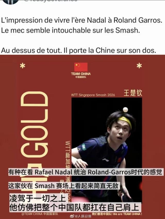 随着王楚钦登顶,全球乒乓球论坛也随之沸腾,然而相较于国内部分的“严苛球迷”,海外绝大部分球迷发出了近乎顶礼膜拜的感叹,他们将王楚钦在这片赛场上的统治力,与网球天王纳达尔相提并论。“有种在看纳达尔统治法网的感觉,这家伙在大满贯赛场上看起来简直无敌!凌驾于一切之上,他仿佛把整个中国队扛在肩上!”这样感性而夸张的评论,在社交媒体上获得了大量的点赞。